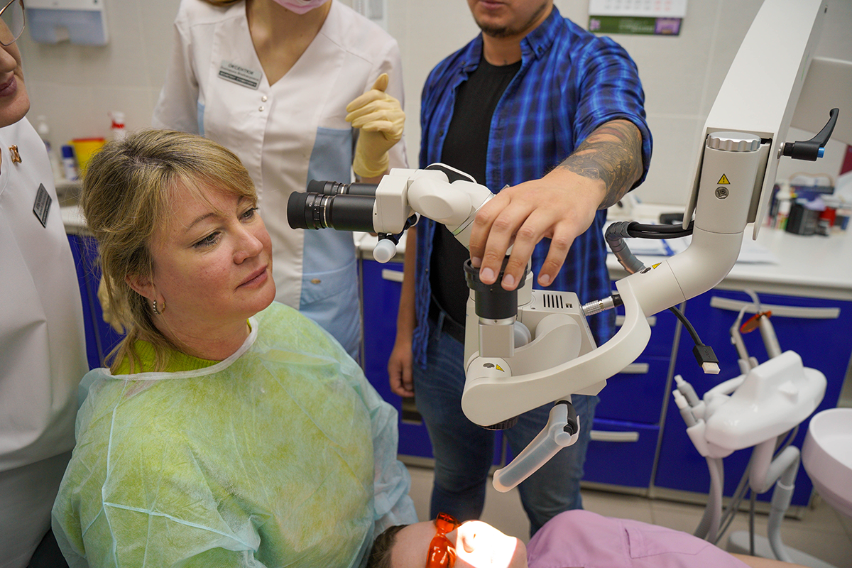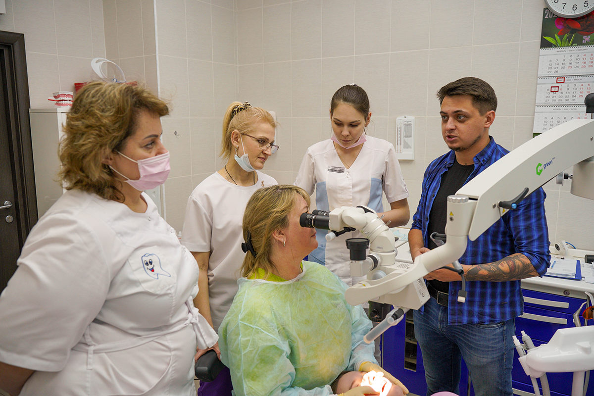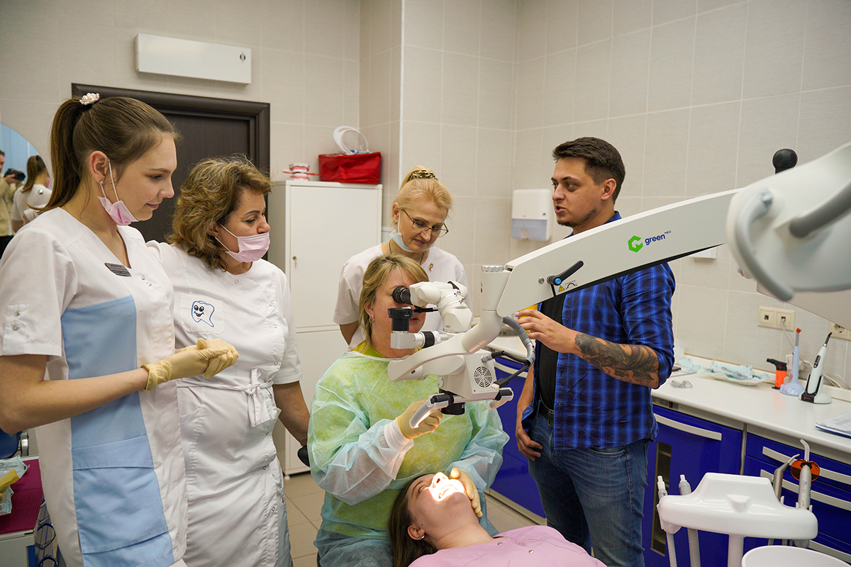 Всё просто: наш менеджер привёз инновационный стоматологический микроскоп GreenMED C-Clear, установил его и провёл обучение, на котором рассказал о всех нюансах взаимодействия с новым операционным помощником.